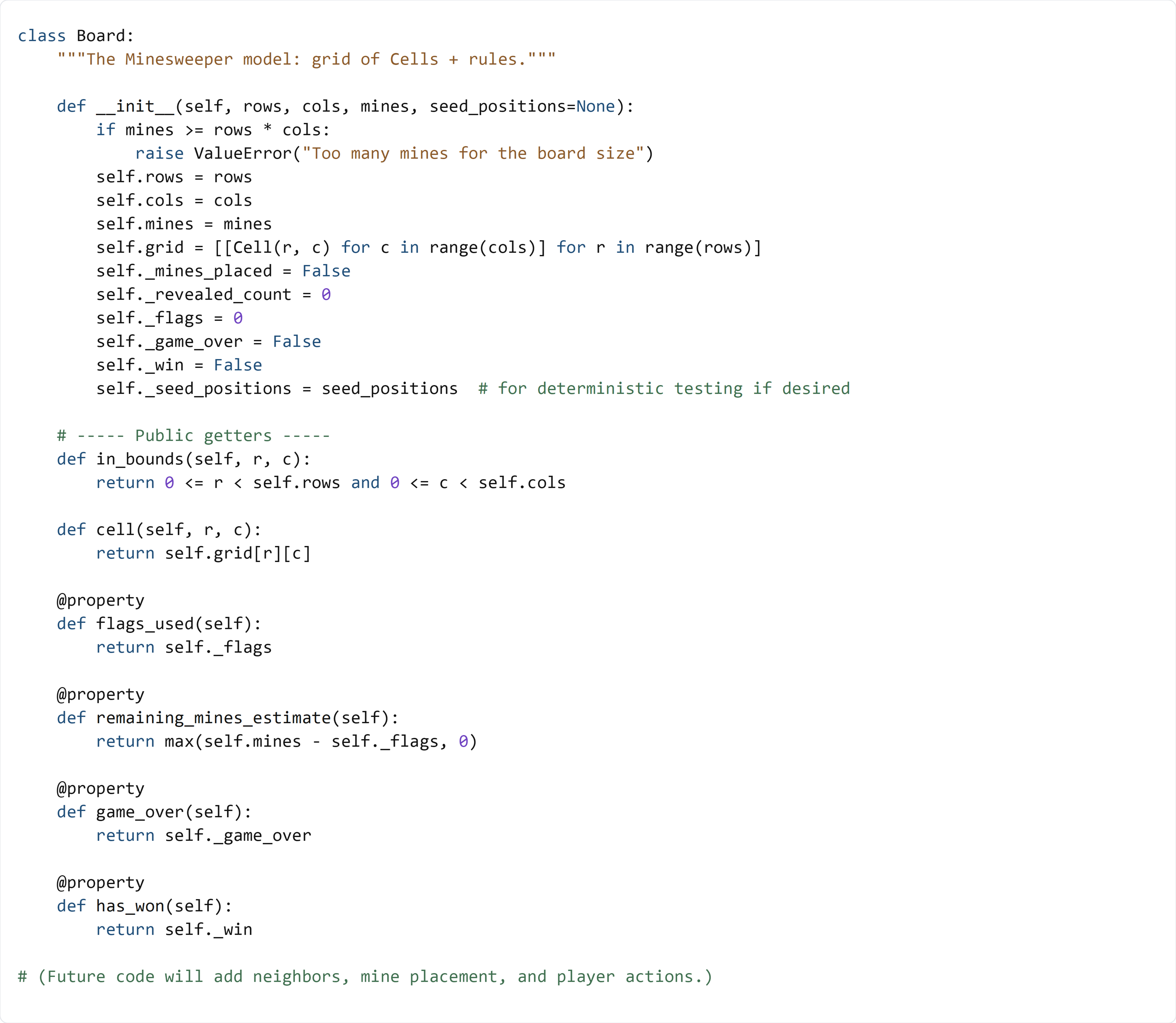In this section, you will add the Board class below Cell in model.py. The board owns every Cell and provides safe, read-only access for the Tkinter UI to query the game state.
