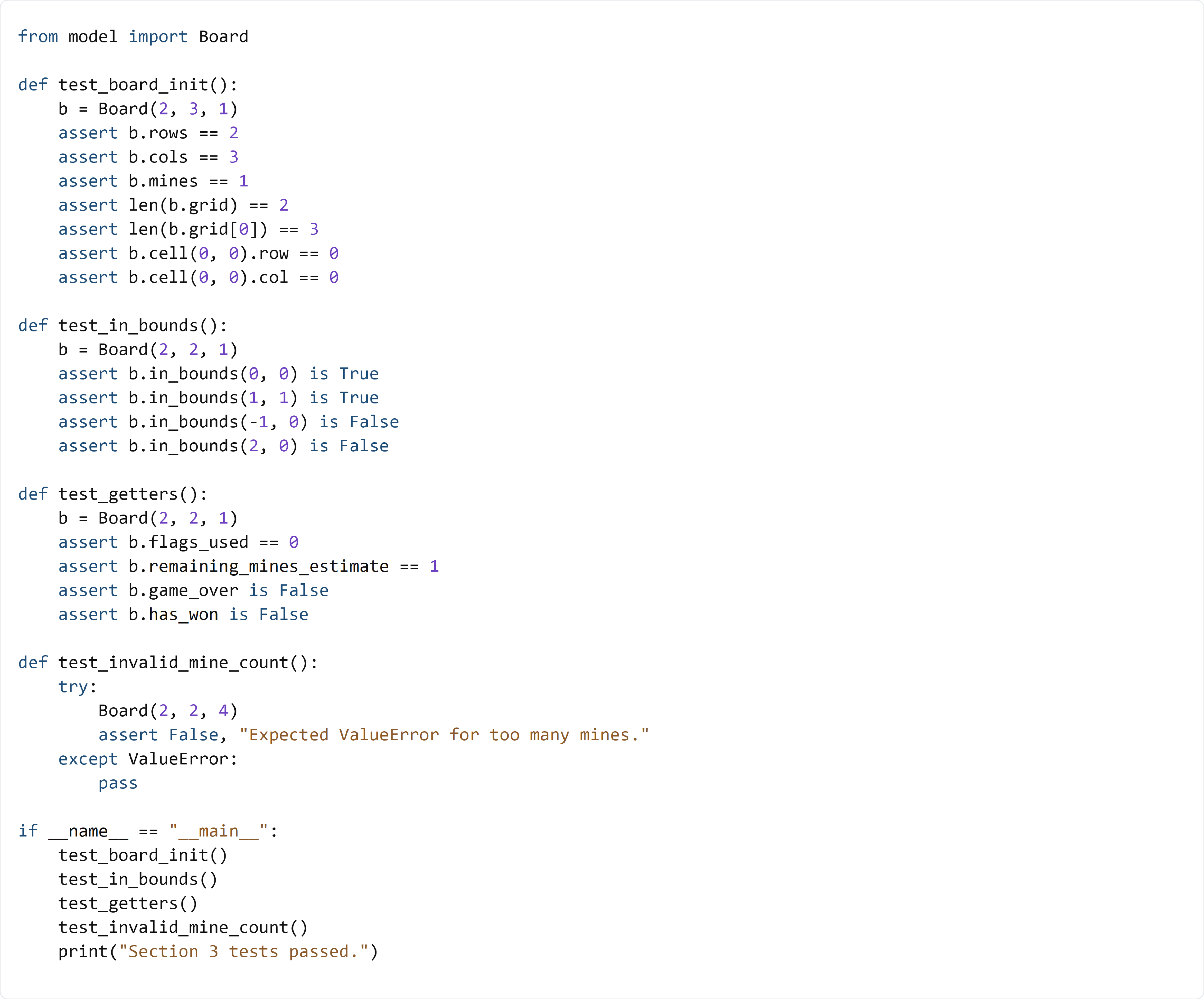 This test builds small boards, checks grid sizing, confirms in_bounds behavior, and verifies the read-only getters. It also confirms that invalid mine counts raise a ValueError.