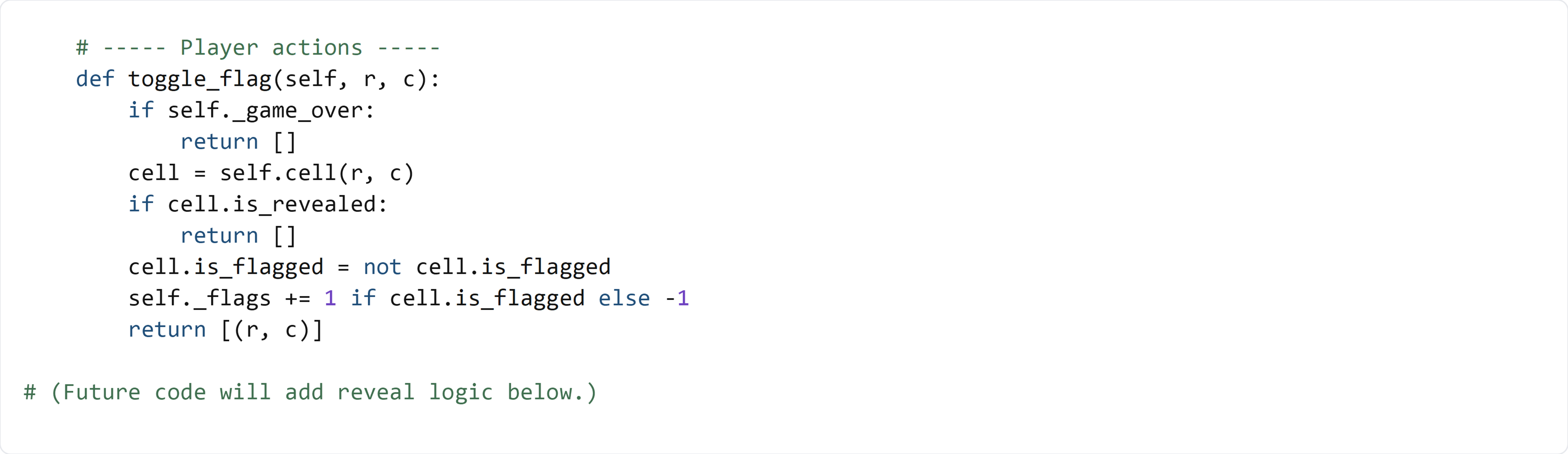 Notice what this method does not do: - It does not check if the flag is “correct.” - It does not end the game. Flags are a player tool. The win condition is handled by reveals (when all safe cells are revealed), not by flag placement.