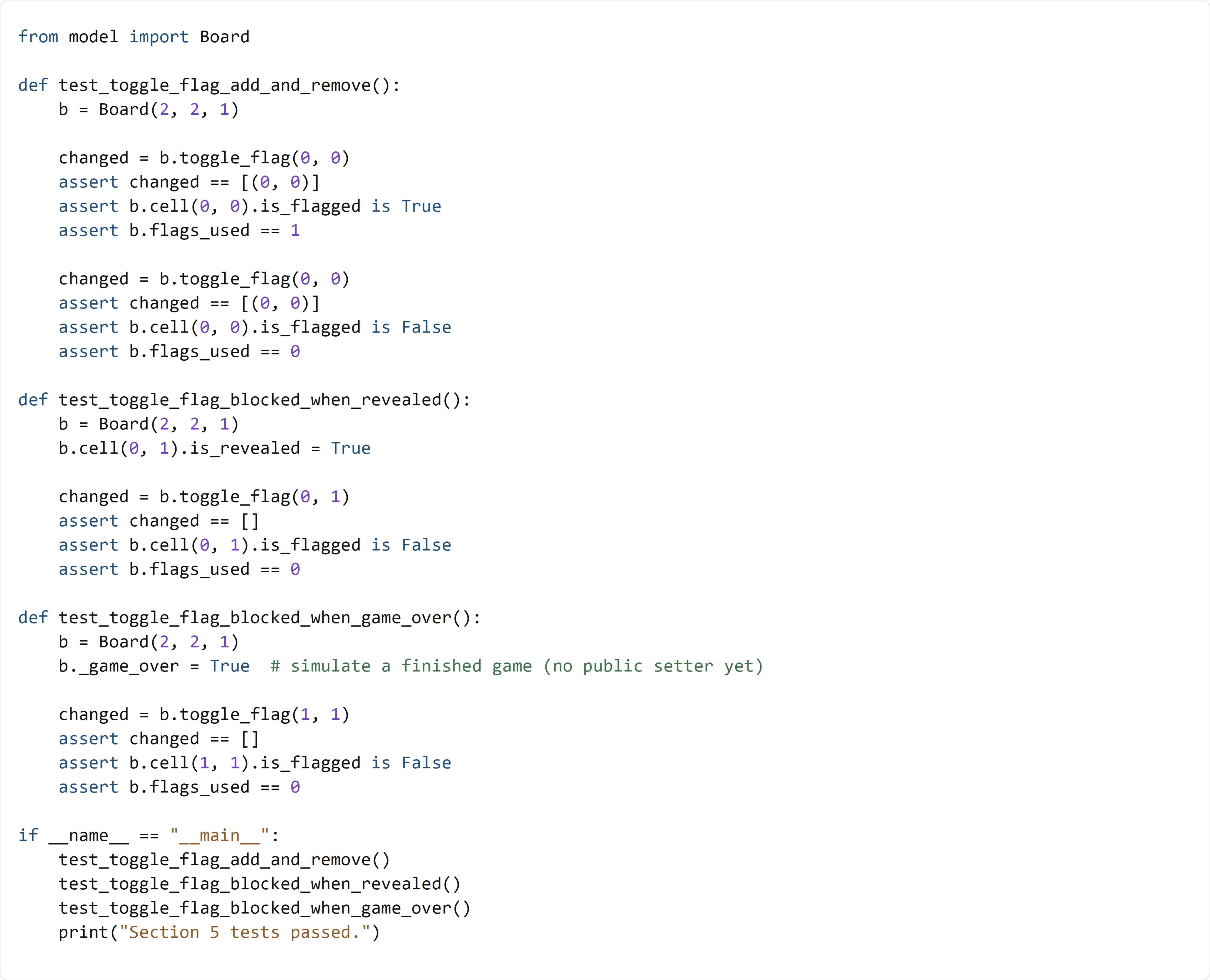 - When the board is in a game-over state, flag actions are ignored. For now, the test sets b._game_over = True directly to simulate that condition.