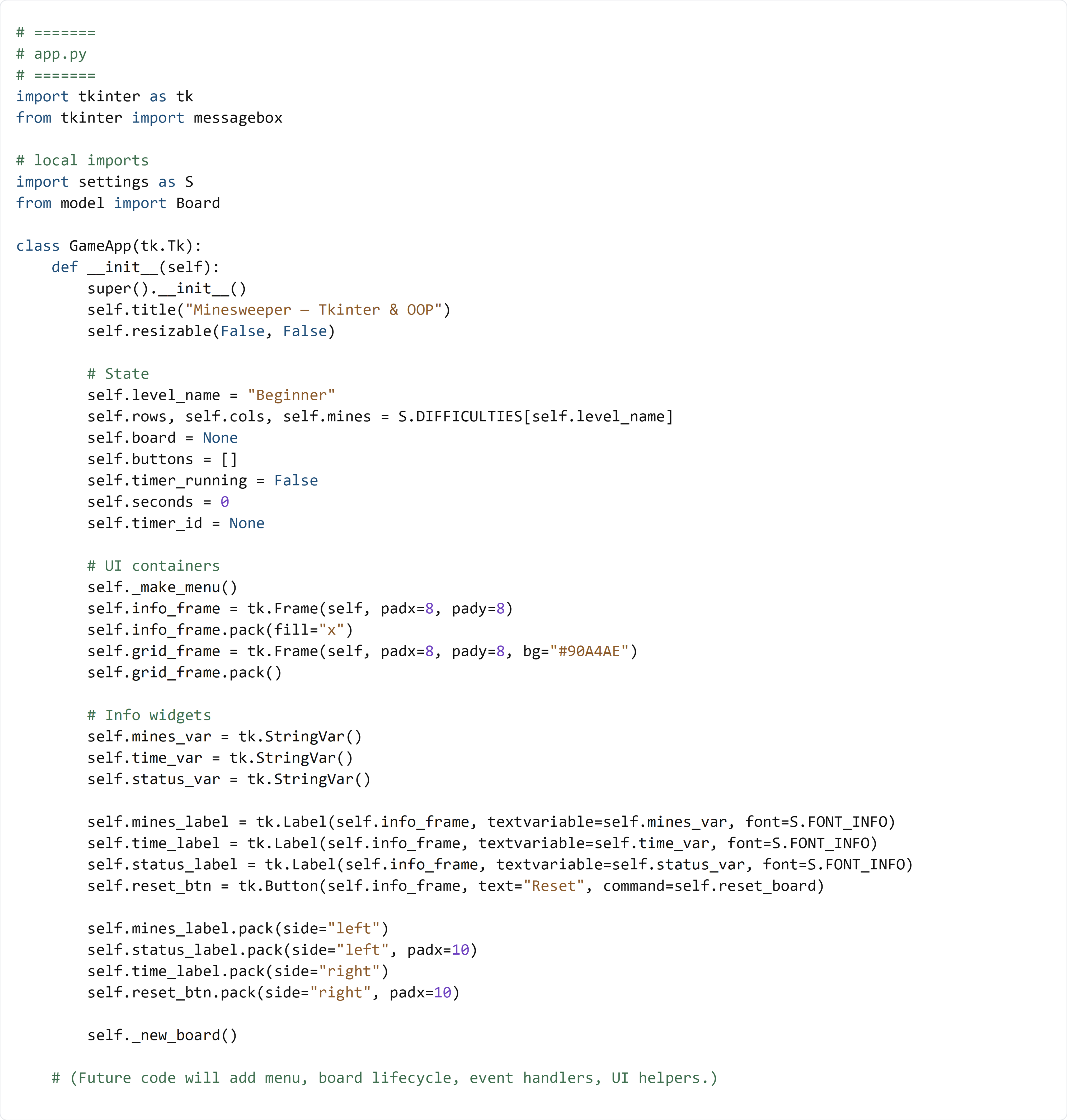 self._make_menu(), self.reset_board, and self._new_board() are called here, but they don’t exist yet. That’s okay for now: we’re building the skeleton first, and later sections will fill those methods in.