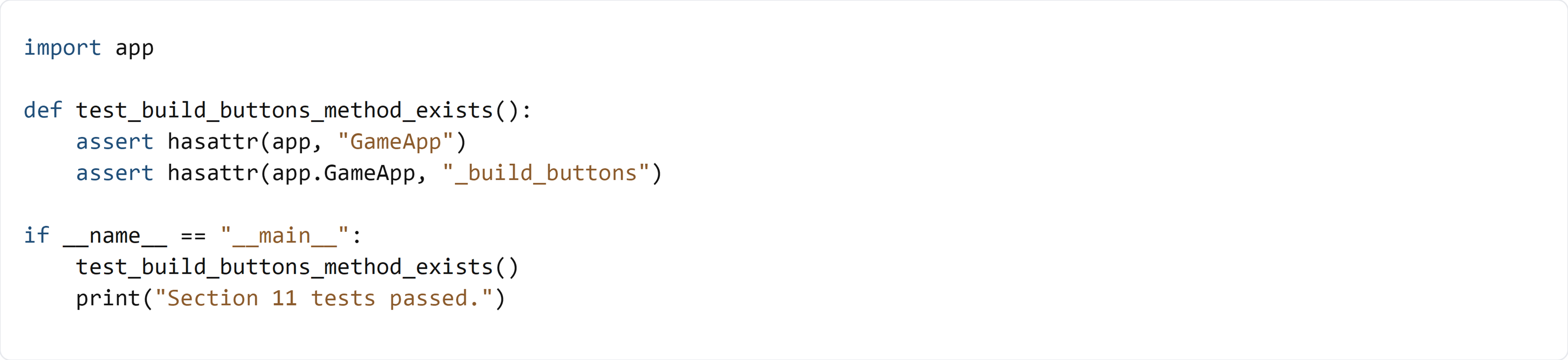 This test verifies that _build_buttons() exists on GameApp. We still avoid instantiating the Tkinter window here because _build_buttons() depends on Tkinter frames and future event-handler methods (on_reveal / on_flag) that will be added in the next sections.