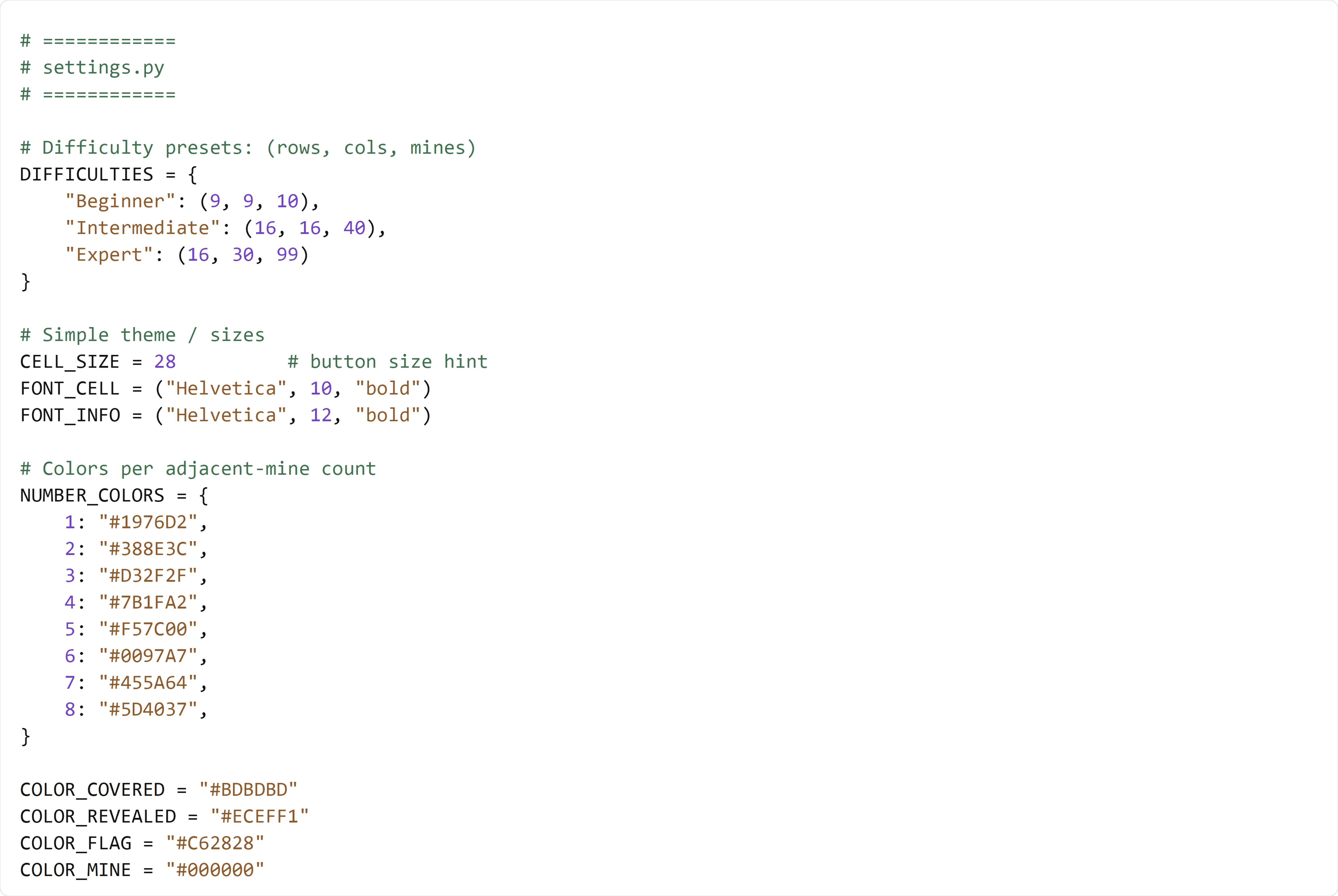 - Dictionaries and tuples for presets (DIFFICULTIES)